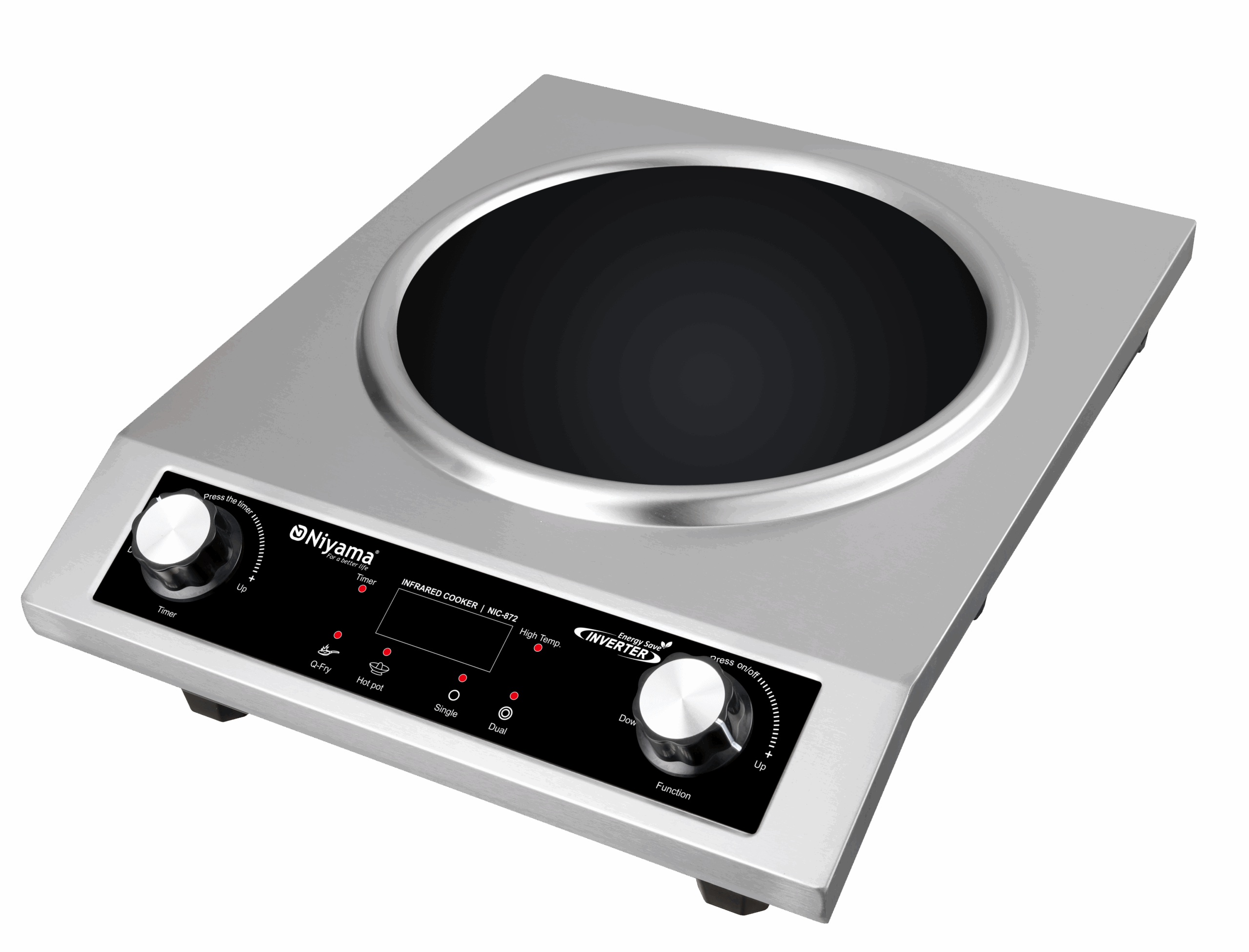 Discover precision and power with the Niyama NIC-872 Infrared Cooker, part of the elegant Curved Panel Series. Designed for modern kitchens, this infrared cooker features a sleek circular heating surface, a metallic frame, and a curved control panel with dual knobs and a digital display for intuitive operation.