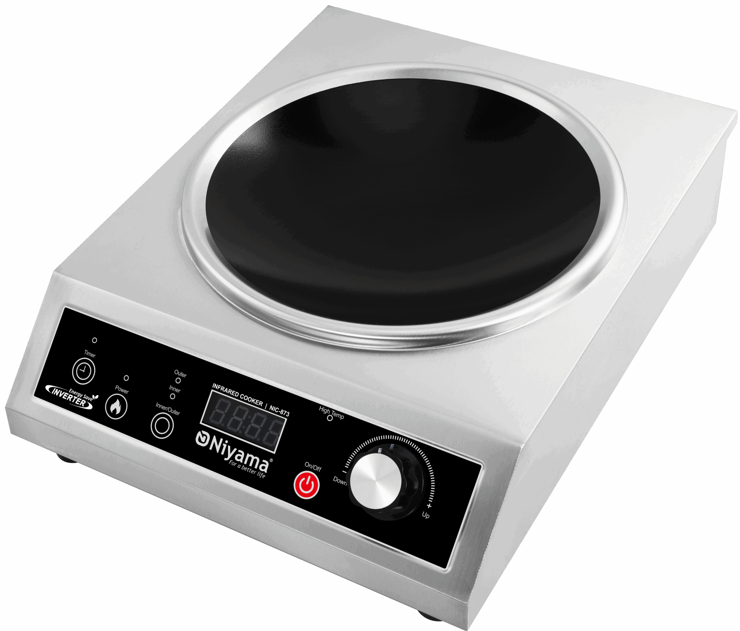Cook smarter with the Niyama NIC-873 Infrared Cooker, part of the stylish Curved Panel Series. Designed for modern kitchens, this infrared cooker features a sleek silver body, black circular heating surface, and a curved control panel with a digital display and rotary knob for precise adjustments.