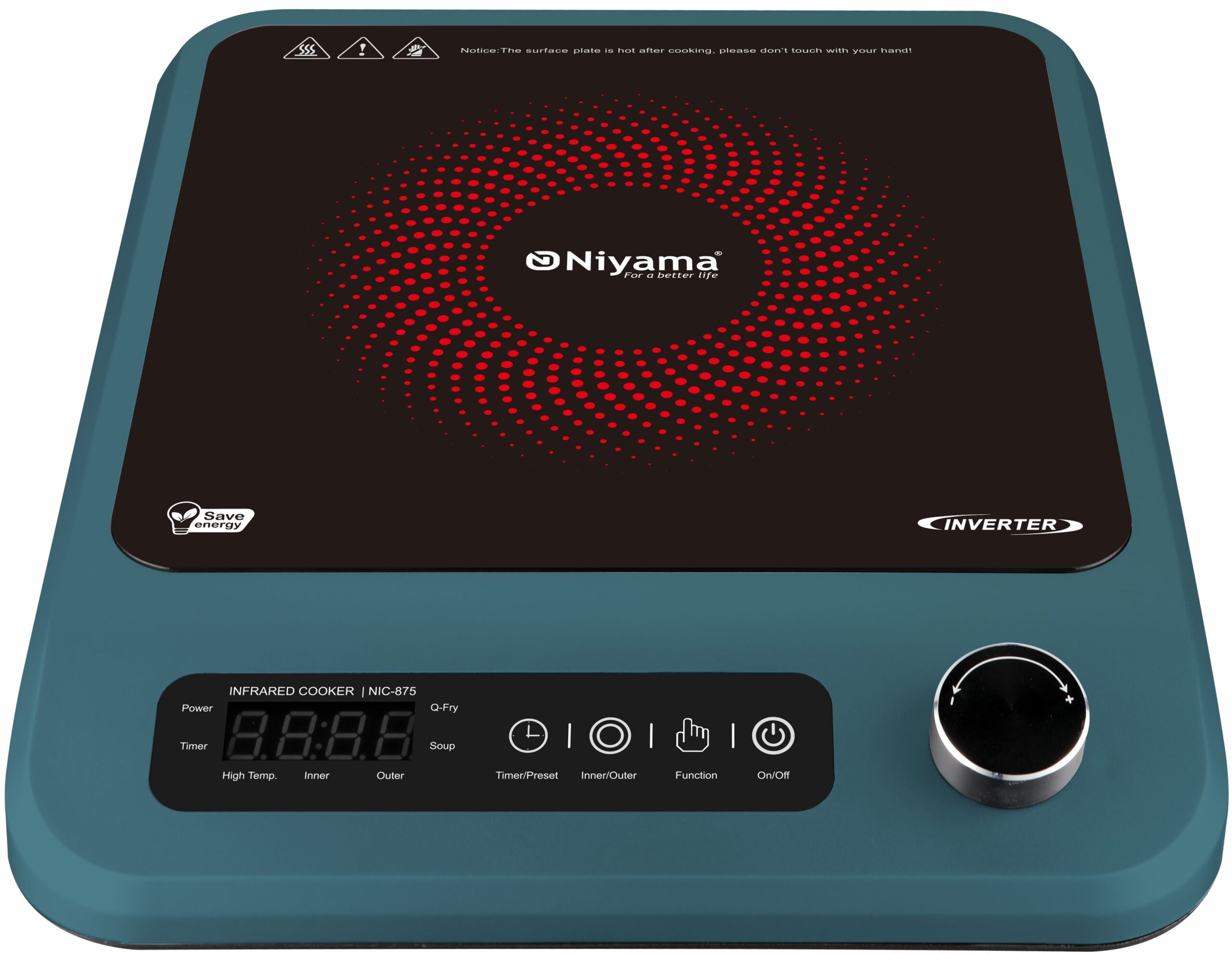 Cook with style and precision using the Niyama NIC-875 Infrared Cooker. With a sleek black top and vibrant blue base, this cooker combines modern aesthetics with powerful performance. The circular red heating zone and digital control panel offer intuitive operation and fast results for all types of meals.